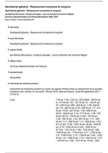 Salles de lecture des archives : By archives departementales de l'eure (creator), georges bourbon (author). Remplacement de la visionneuse des fonds numérisés en raison de la fin de l'utilisation de la… modification de l'accès à nos image en ligne : Direction des archives de france rapport au ministre sur l'administration des archives nationales, de?partementales, communales et hospitalie?res: Répertoire numérique des archives départementales de l'hérault.